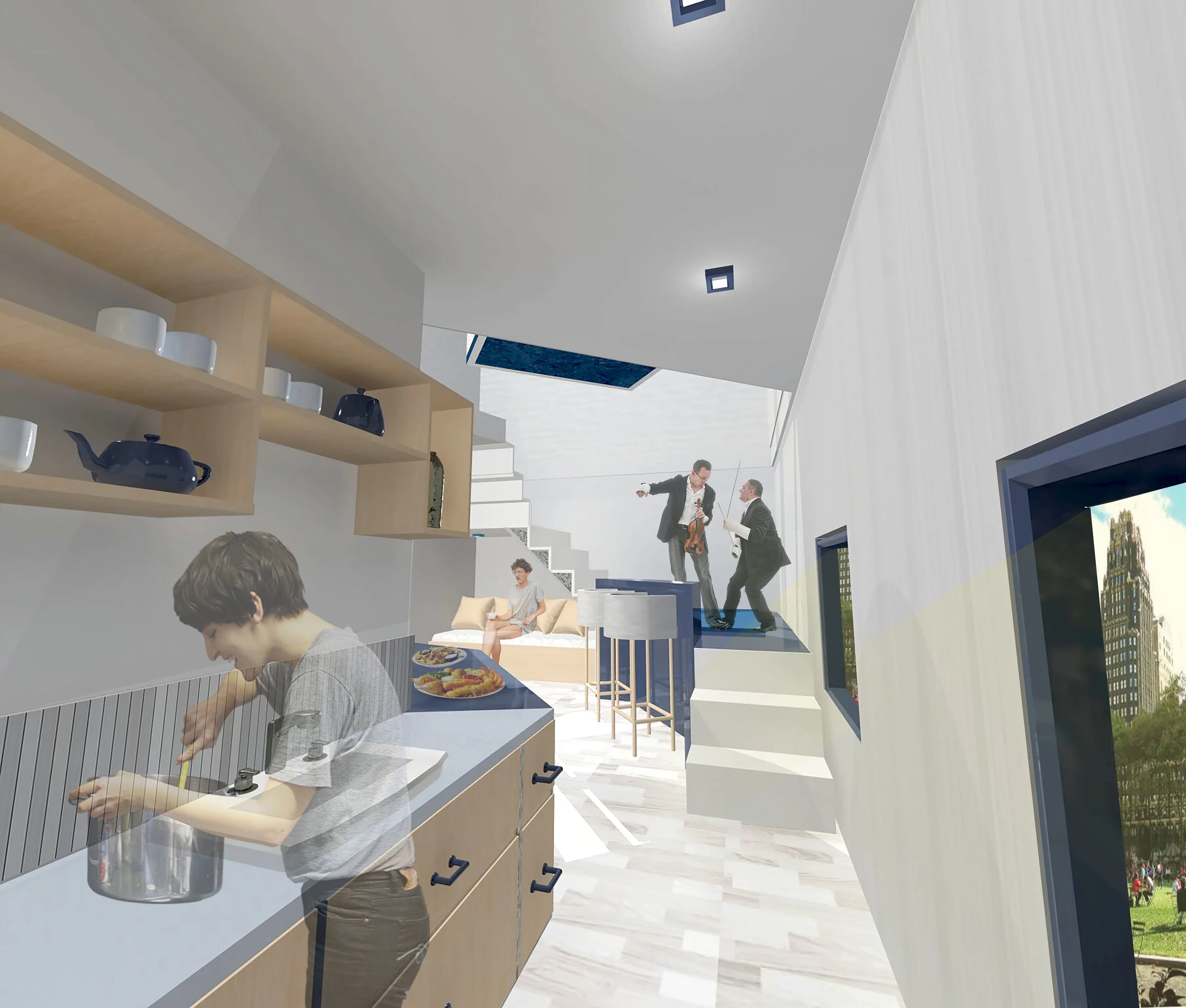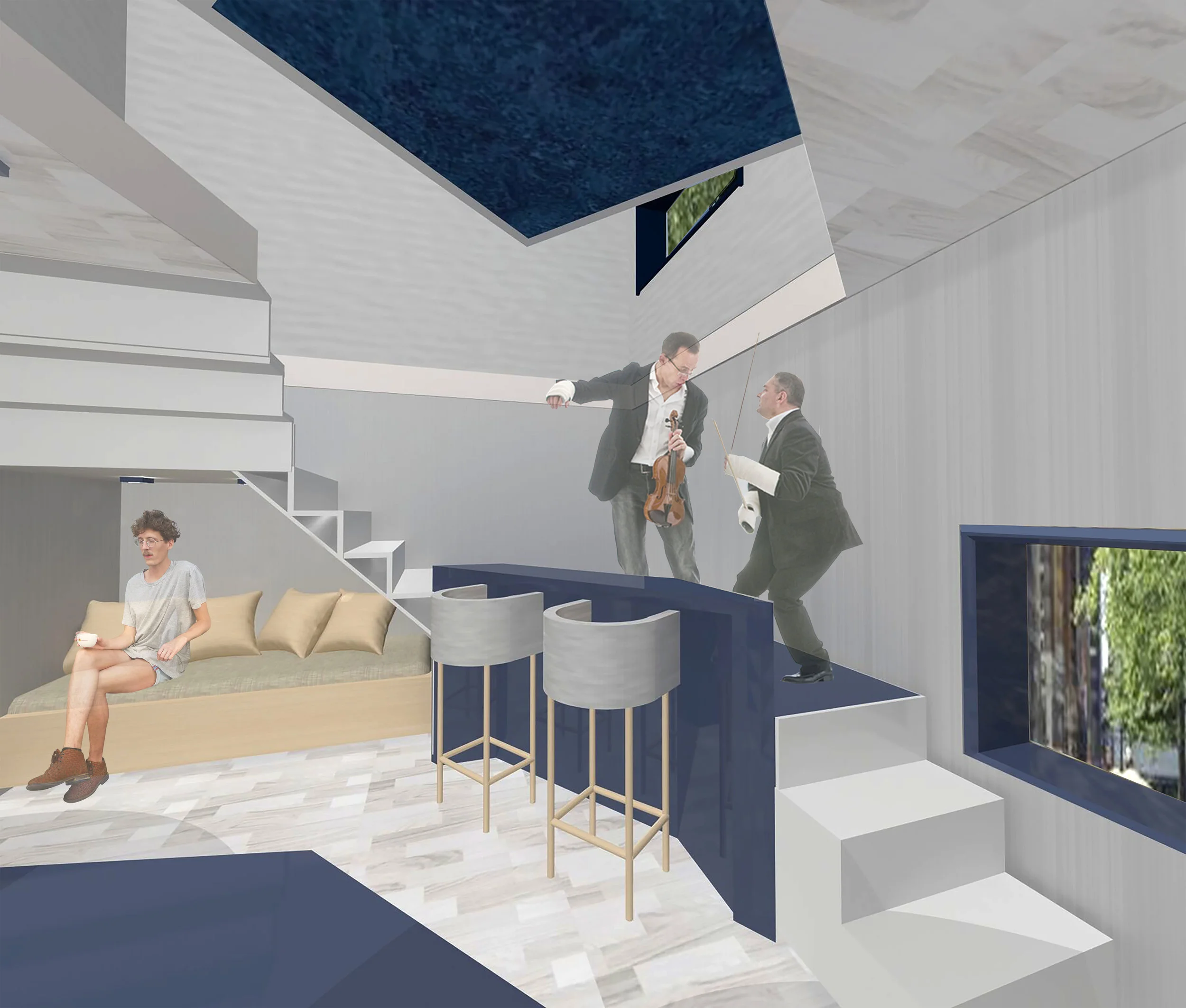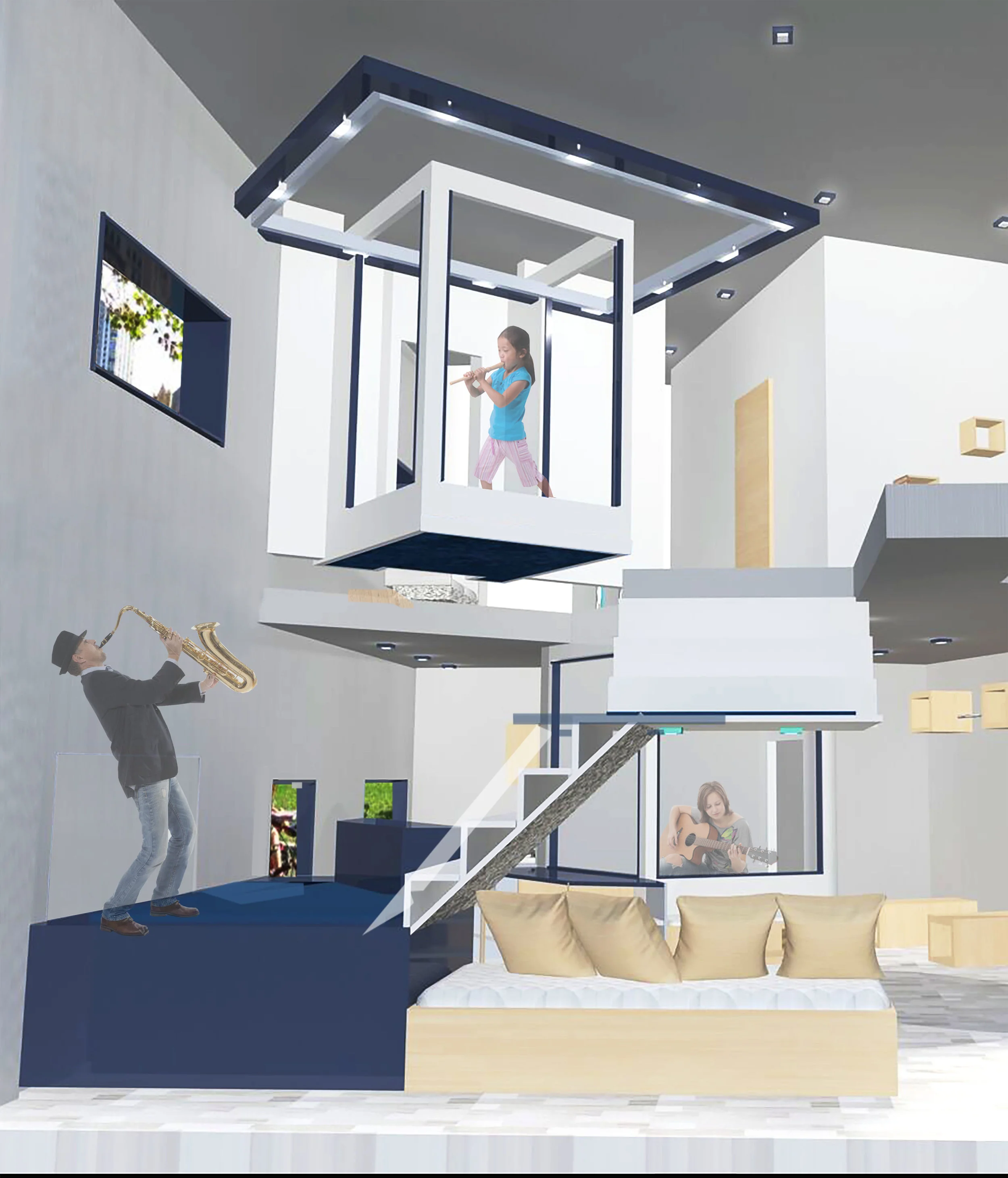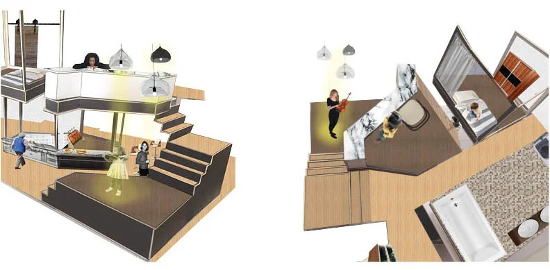 The design proposes performing stages within a residential space for a musician family with four members. Hence, a unity of separation and coherence need to be created, the apartment should provides spaces of intimacy while also accommodating for a group of guests by distributing people to certain areas. Due to the size limitation, certain areas need to have dual functionality to compensate the lack of room. The design stretches out the limitation of the space, allows performing space, by adding flexible of certain area. There are three performing stages within this residential space that in general are stair landing, instrument storage and child musical practice room. Different level of these platforms creates a hierarchy, therefore music flow from 3 different direction, where it bounces off surrounding walls for room- filling sound.
